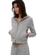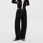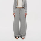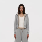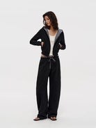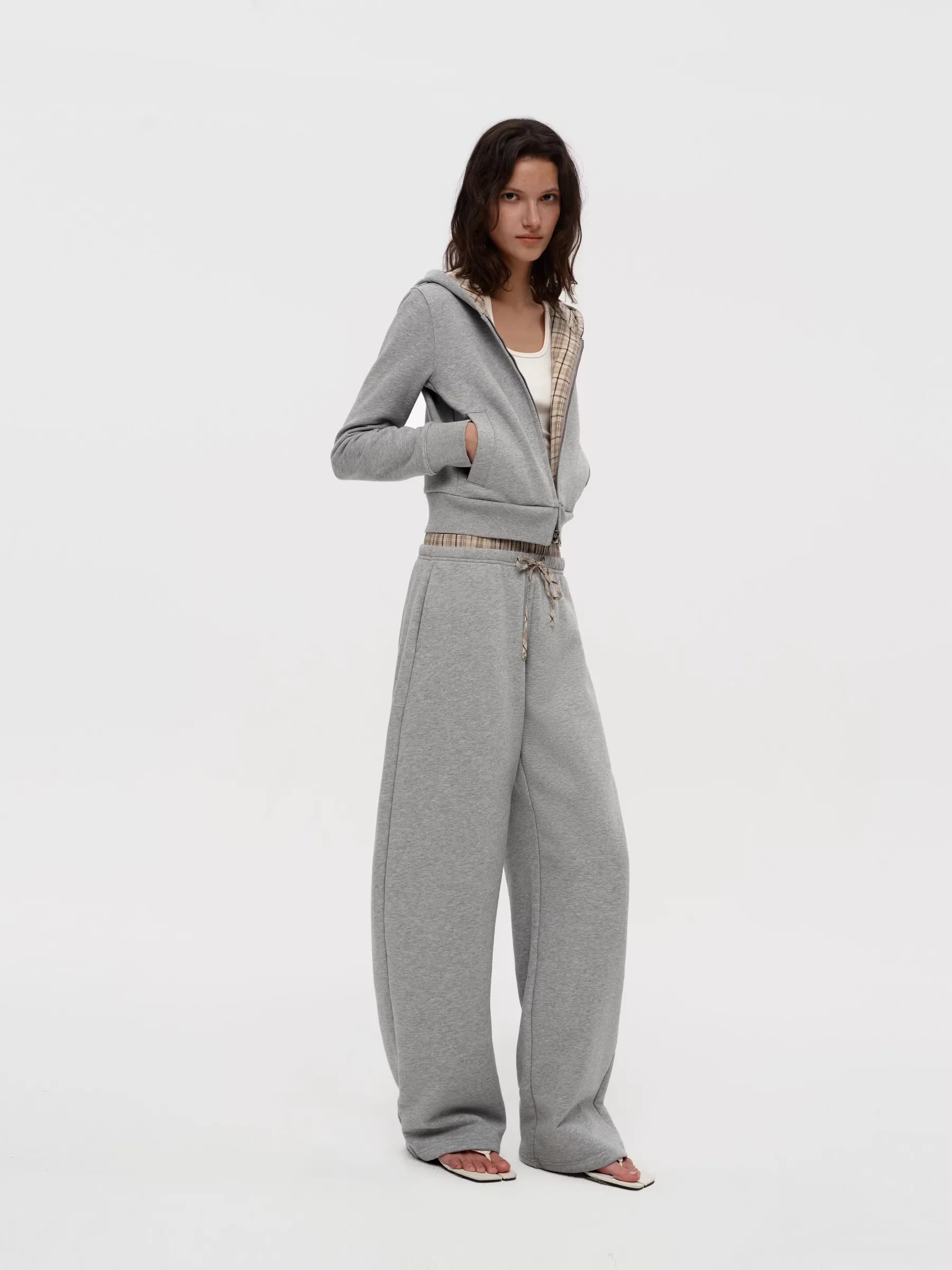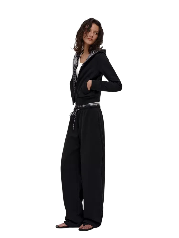 This two-piece loungewear set for women includes a cropped zip-up hoodie and matching wide-leg sweatpants. The hoodie features a plaid patchwork lining inside the hood and adjustable drawstring details for added comfort. The sweatpants are designed with a curved leg silhouette and a double waist look, showcasing a visible plaid waistband under the primary drawstring waist. Layered over a white tank top, this casual set offers a relaxed and stylish look suitable for everyday wear.