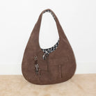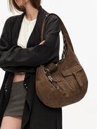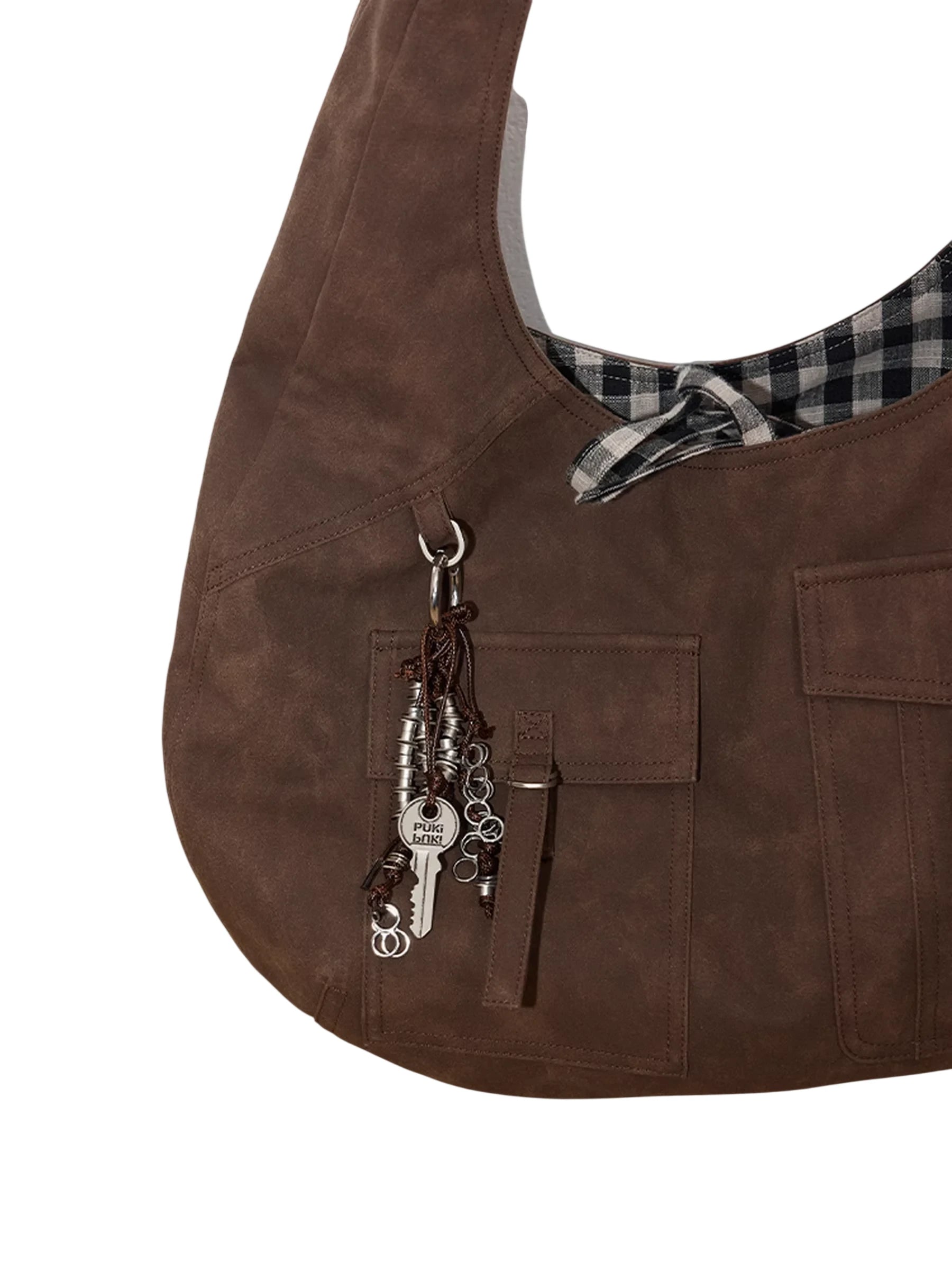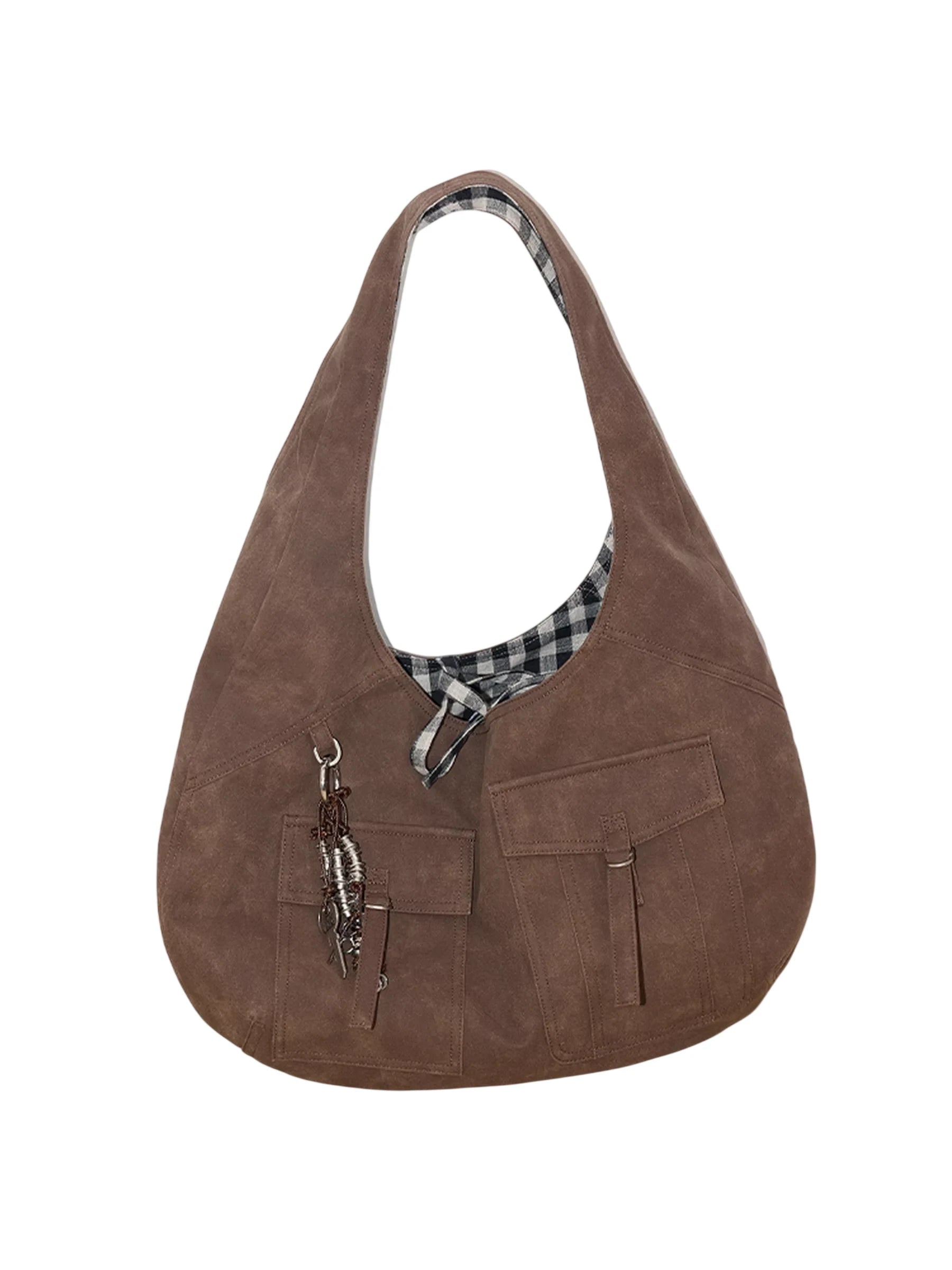 This stylish reversible tote bag features a vintage-inspired dumpling silhouette, crafted in soft suede or faux leather for a slouchy, casual look. Designed for contemporary urban fashion, it includes functional details like a large front pocket and keychain accessories. Perfect as an everyday shoulder bag, its spacious interior and versatile design make it an ideal choice for women on the go.