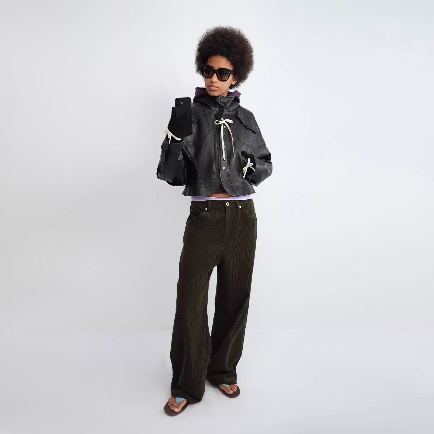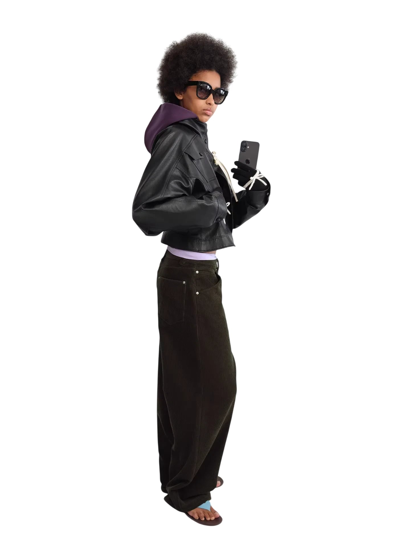 Elevate your streetwear look with this fitted black faux leather jacket, tailored with a modern stand collar and distinctive curved sleeves. Designed for a bold, fashion-forward aesthetic, this cropped jacket features drawstring details at the neck and cuffs for added edge. Worn by a female model, it layers effortlessly over casual pieces like hoodies, offering both versatility and statement appeal. Perfect for creating a strong, contemporary silhouette.