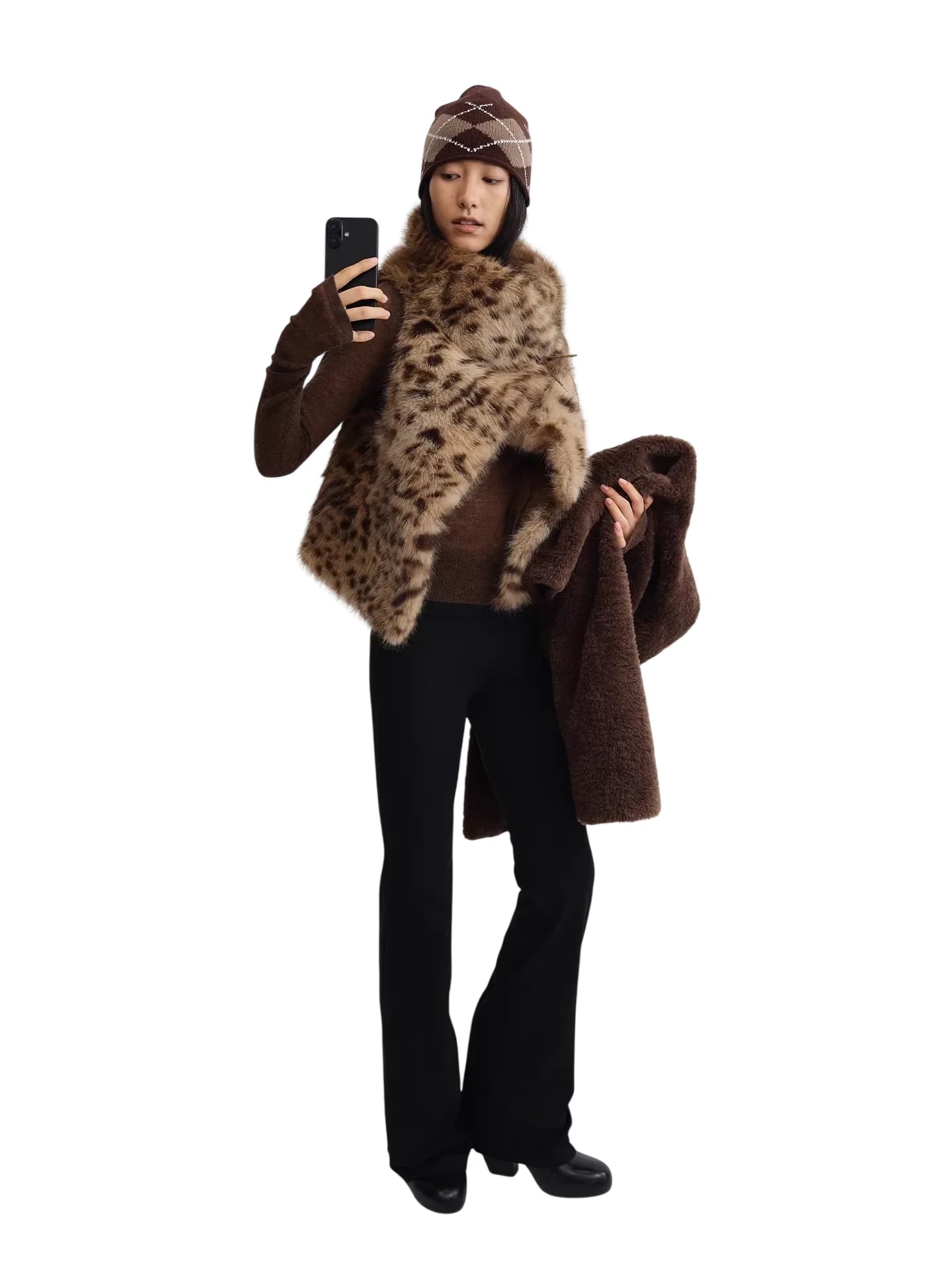 Elevate your winter layering with this eco-friendly faux fur vest, designed in a stylish gray-brown shade with a chic leopard print. Perfect for adding warmth and texture, the vest features a one-piece cut that flatters the silhouette. Ideal for cold-weather styling, it pairs effortlessly with knit tops and wide-leg trousers. A versatile addition for any woman's winter wardrobe.