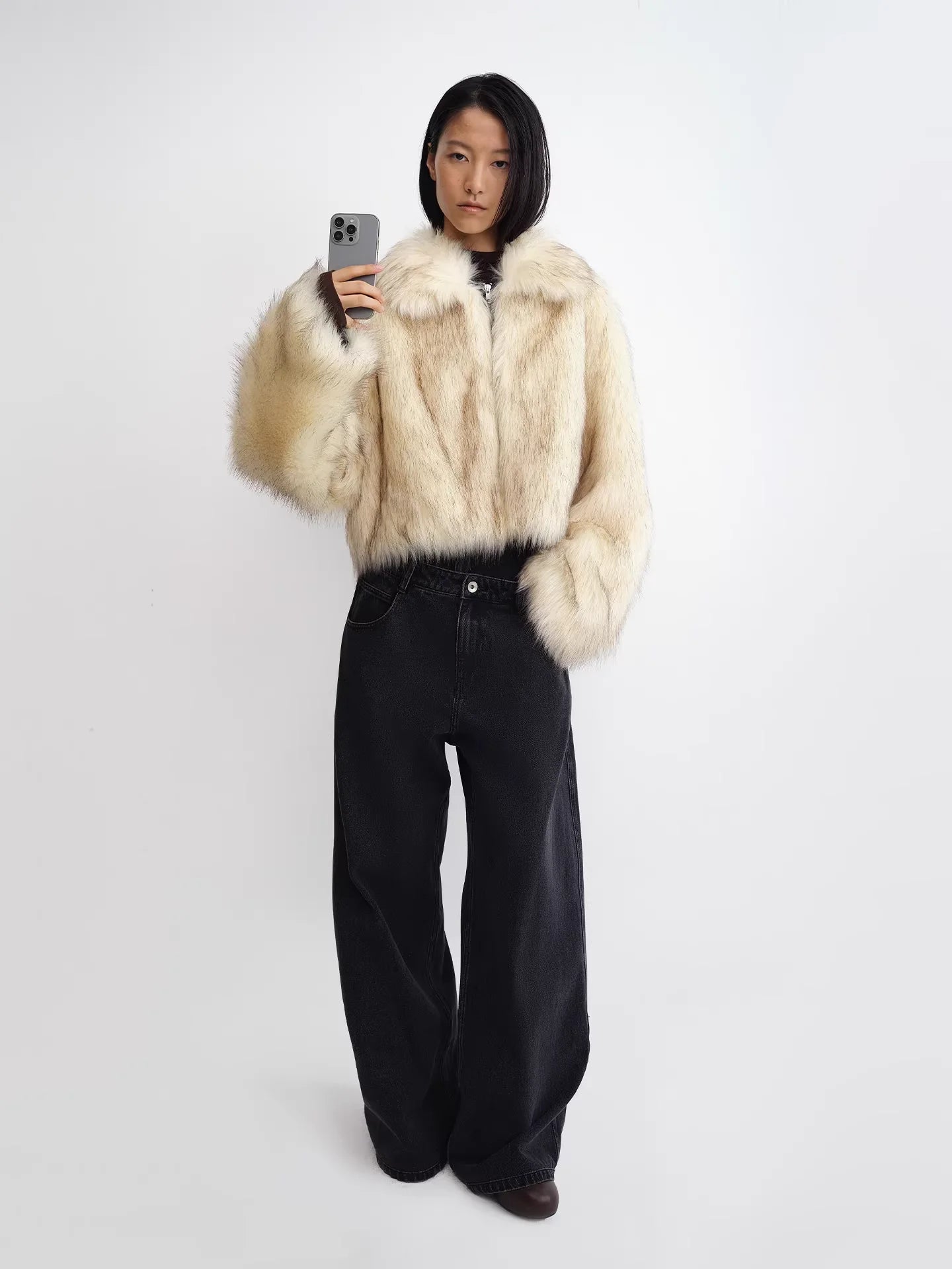 RARELY ALIKE Short Faux Fur Jacket with Suede Lining in Dark Coffee and White