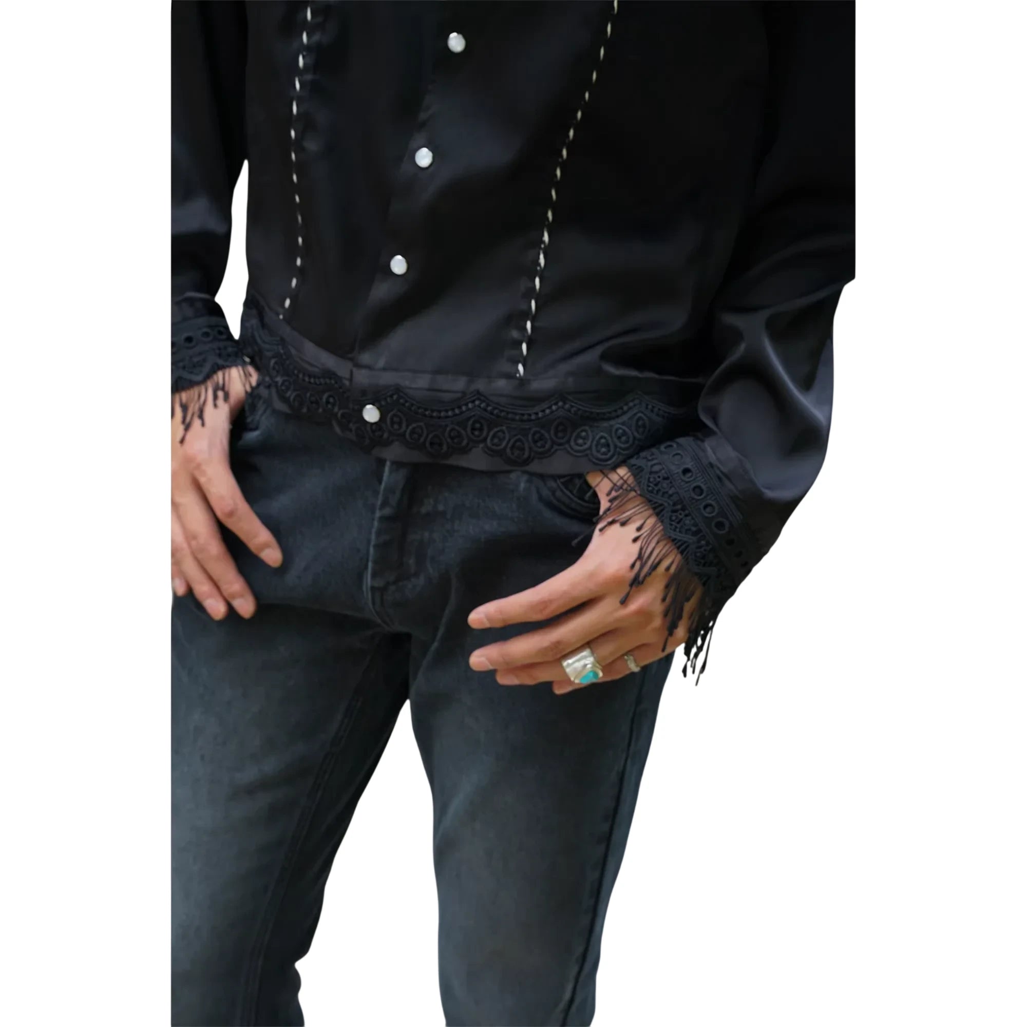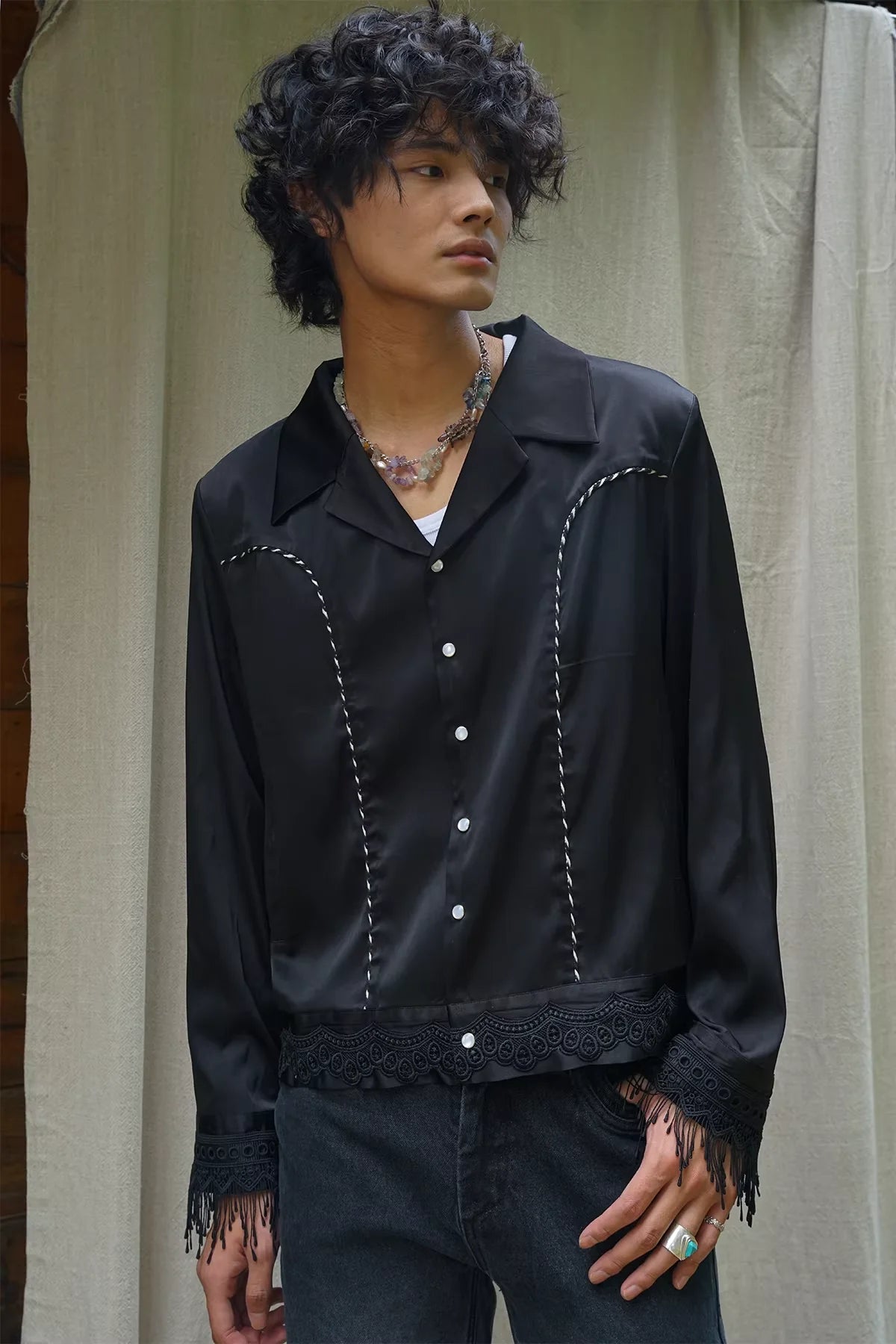 This stylish men's shirt jacket blends classic tailoring with contemporary details. Featuring a sleek all-black design, it is accented with elegant ribbon and tassel embellishments, complemented by metallic studs for a refined edge. The draped silhouette and lightweight construction make it ideal for spring and summer layering.
