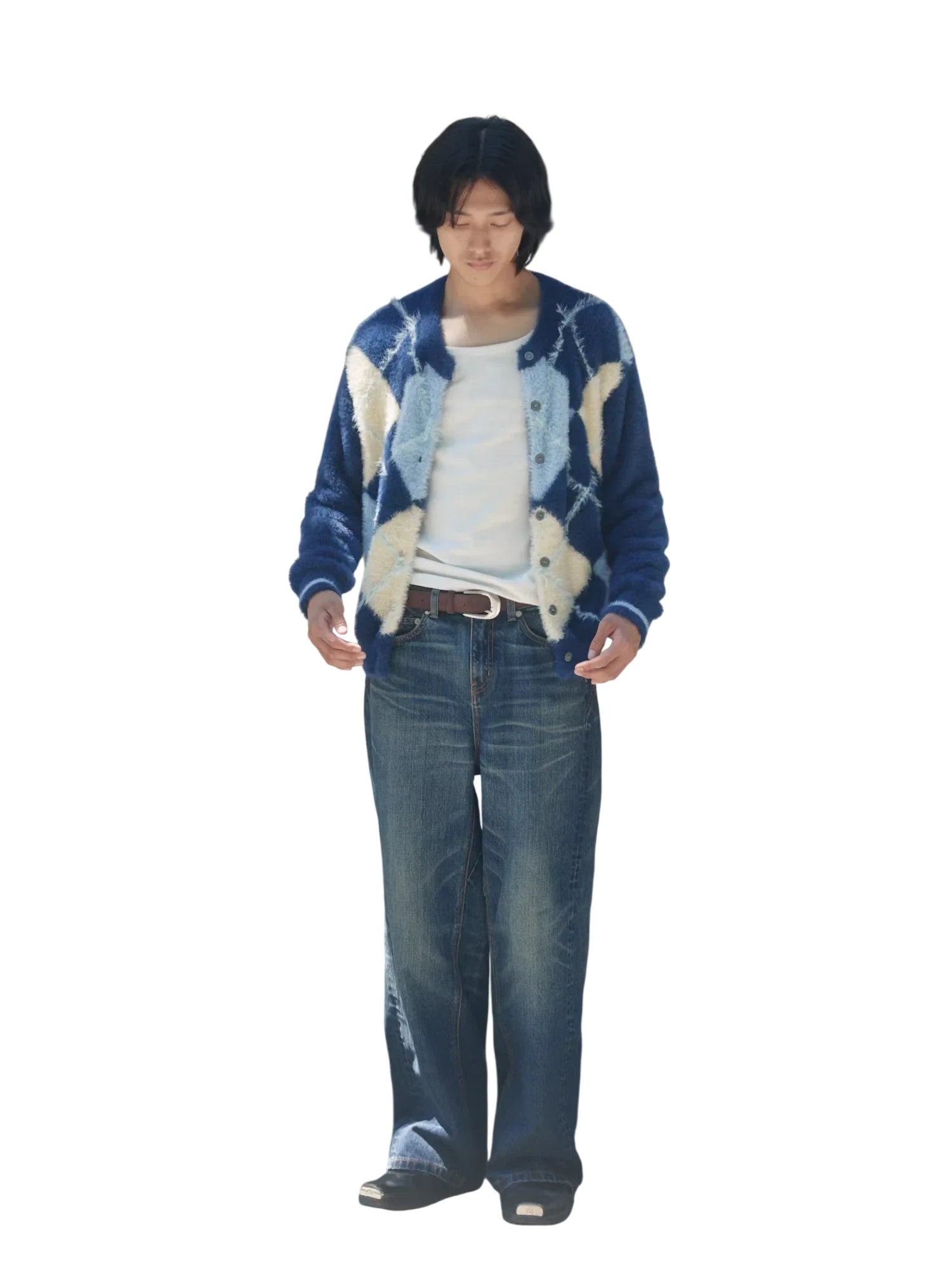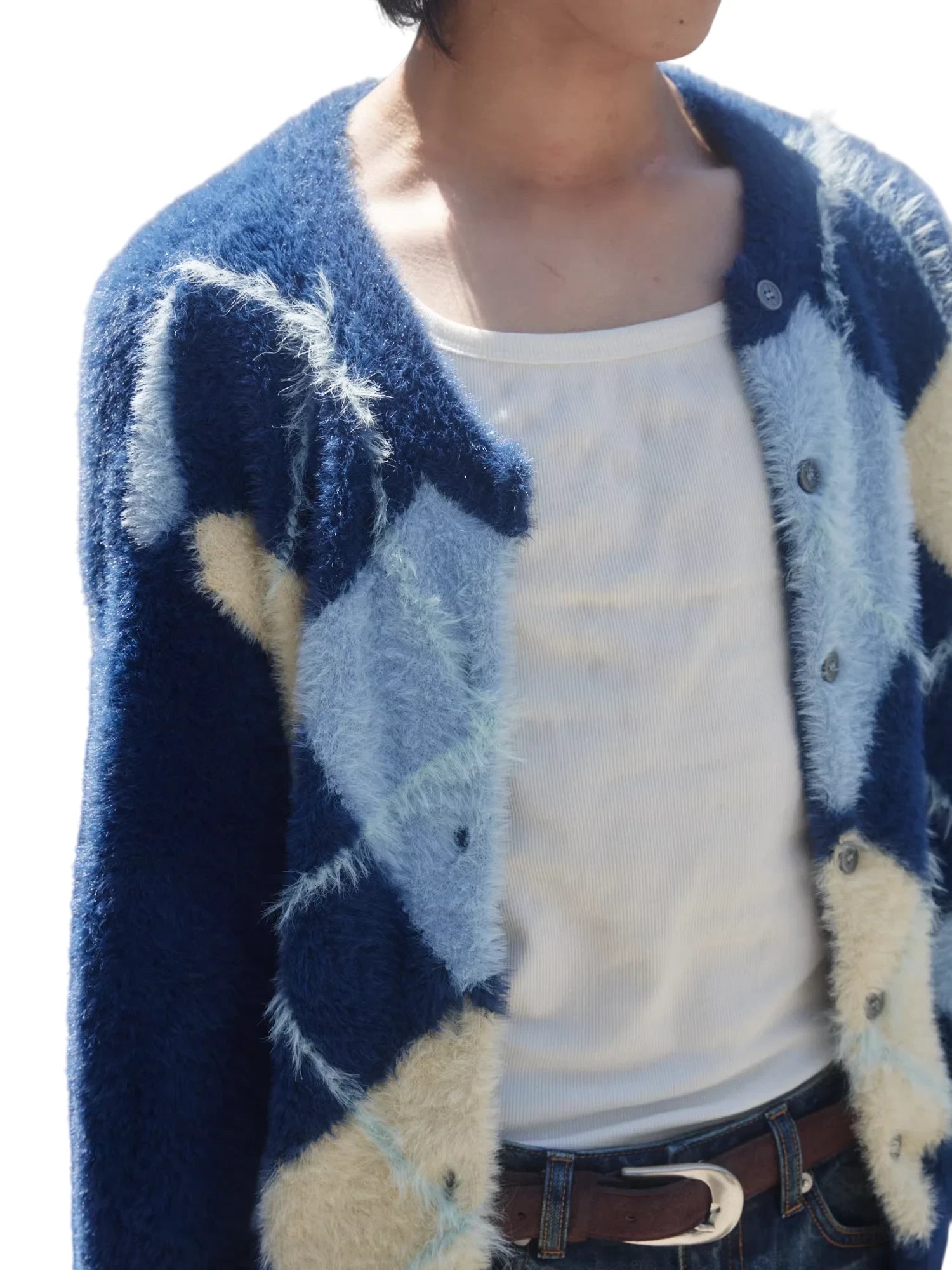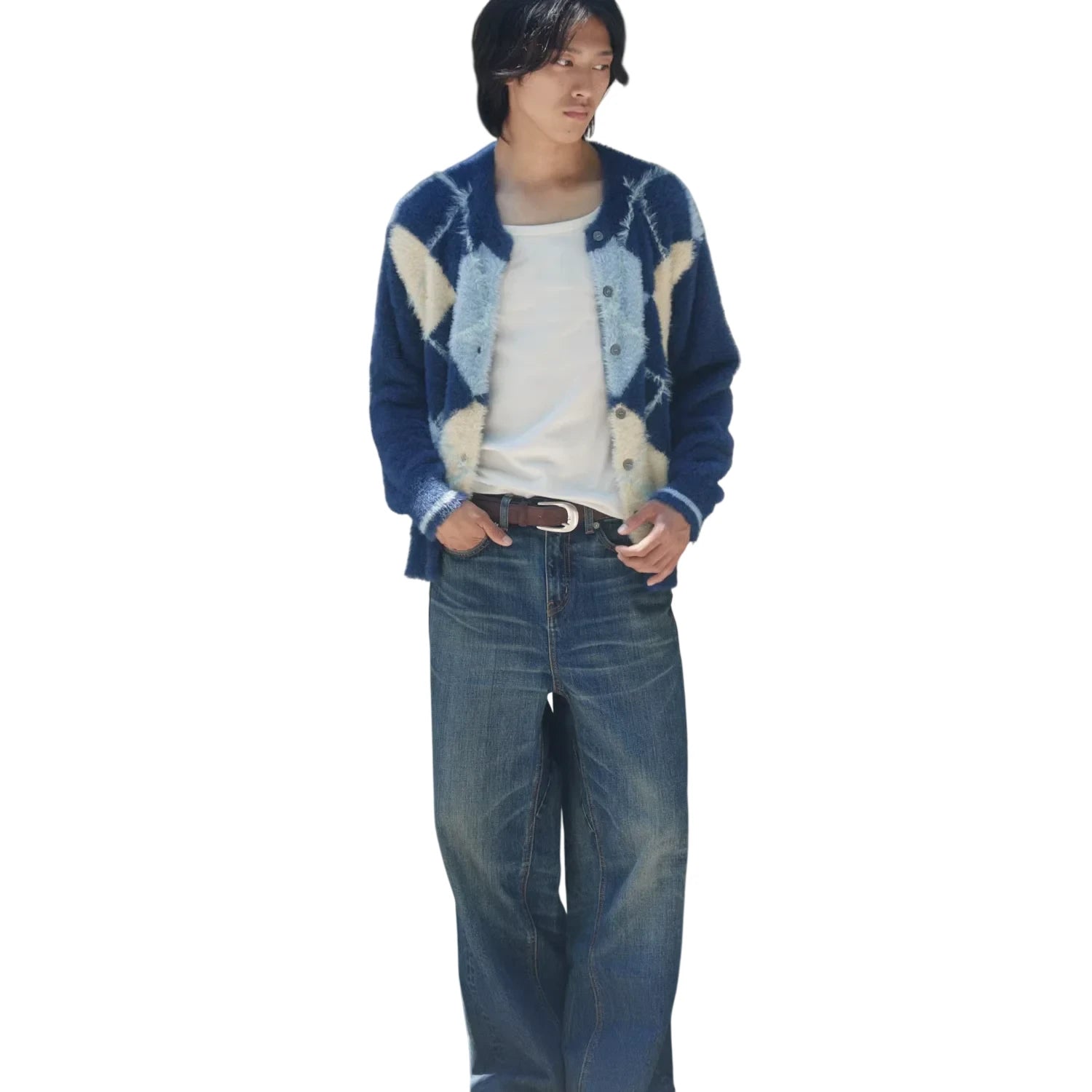 Elevate your casual style with this men's knitted cardigan featuring a bold diamond argyle pattern in light blue and cream tones. Crafted with soft faux mink for ultimate comfort, this oversized long sleeve jacket offers a relaxed fit perfect for layering. The deep blue base color adds a vintage flair, making it an ideal piece for street-style looks or everyday wear.