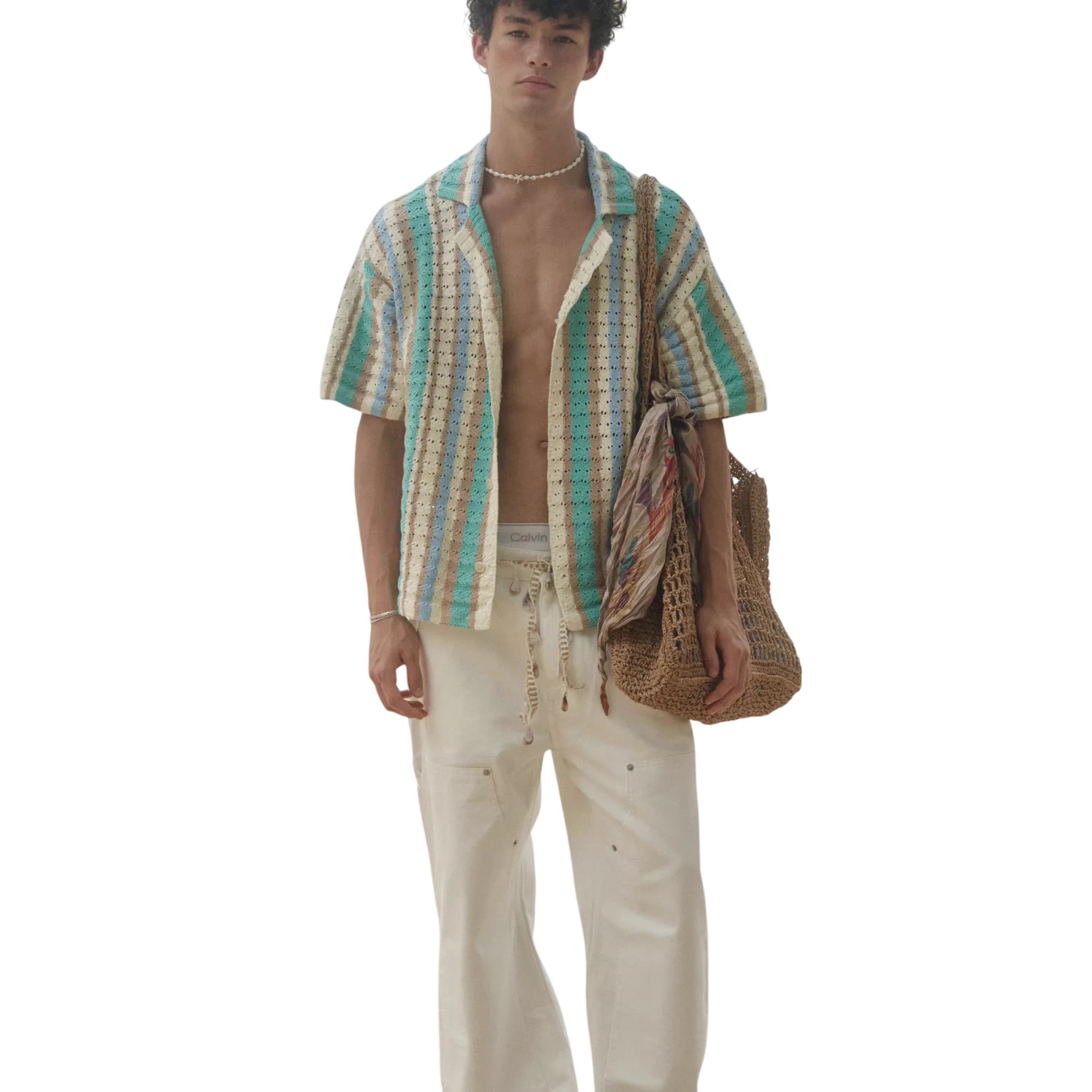 Embrace effortless beach style with this men's short sleeve crochet knit shirt, featuring vertical stripes in soothing blue, beige, brown, and white tones. Crafted with a hollow design for breathable comfort, it's ideal for warm-weather outings. Pair it with relaxed pants for a laid-back, tropical look.