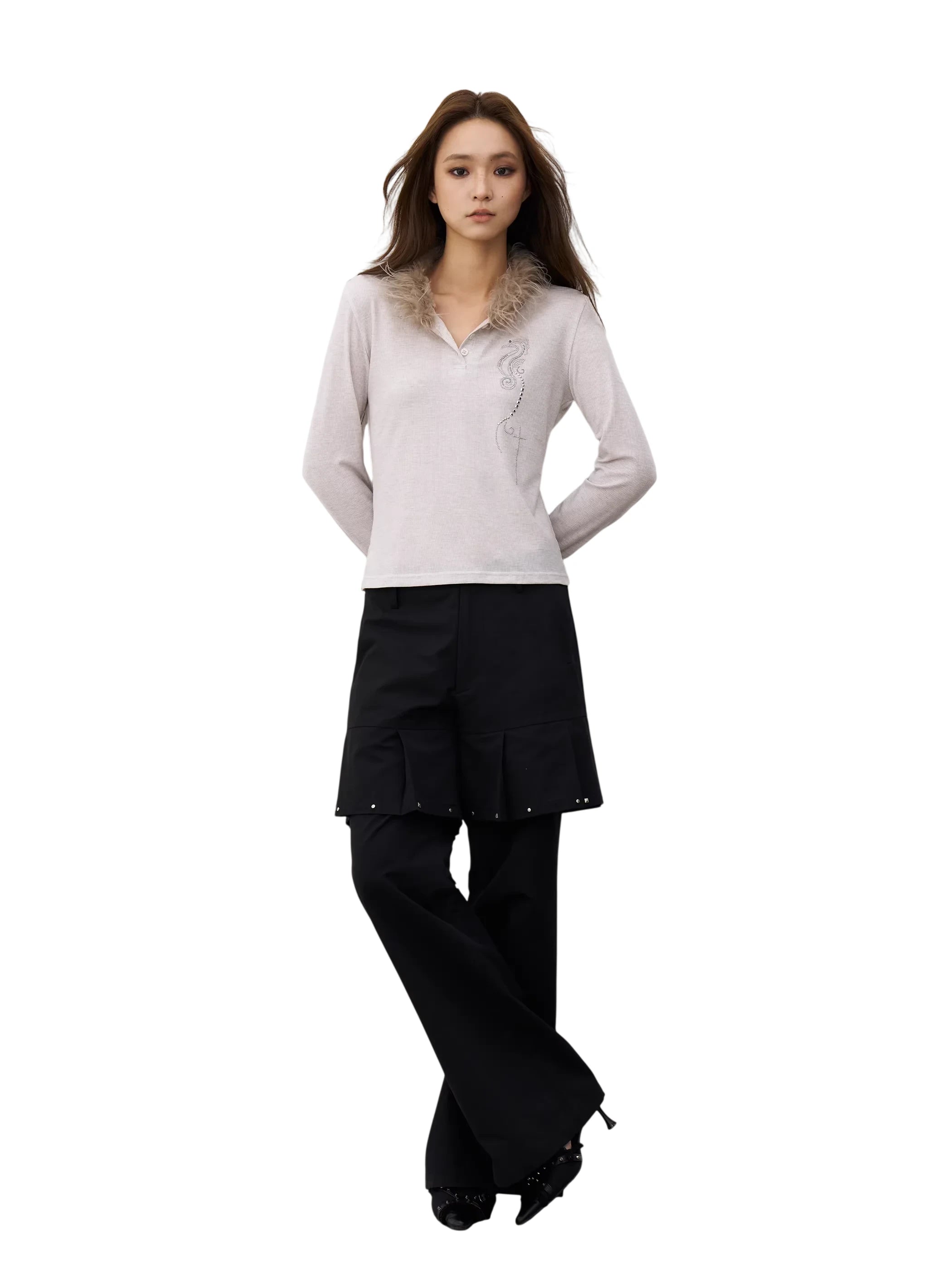 This modern two-piece pant design offers a bold fashion statement for the autumn and winter seasons. Featuring wide-leg black trousers layered with a skirt-style pleated overlay, the look is elevated with beaded rivet detailing for added texture and dimension. Designed with a contemporary silhouette, these pants present an avant-garde touch perfect for stylish statement-making.