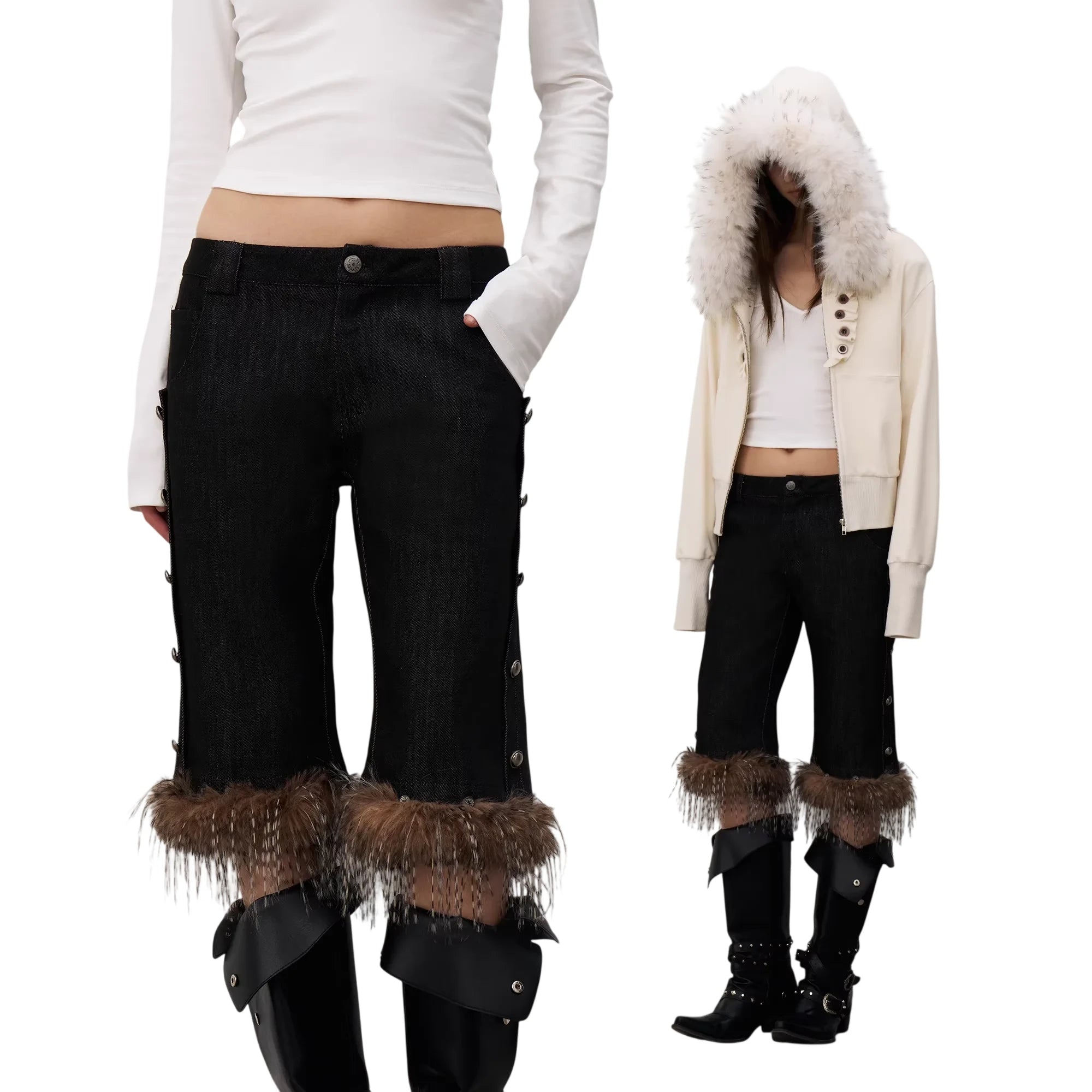 Make a bold fashion statement with these avant-garde women's Bermuda shorts, crafted from heavyweight raw denim. Designed for autumn and winter, these mid-rise shorts feature a unique two-way wear design with detachable plush trim along the hem, giving the garment a dramatic and edgy twist. Decorative button closures run down the outer side seams, adding visual interest to the silhouette. Ideal for layering, style them with boots and tops for a contemporary streetwear look.
