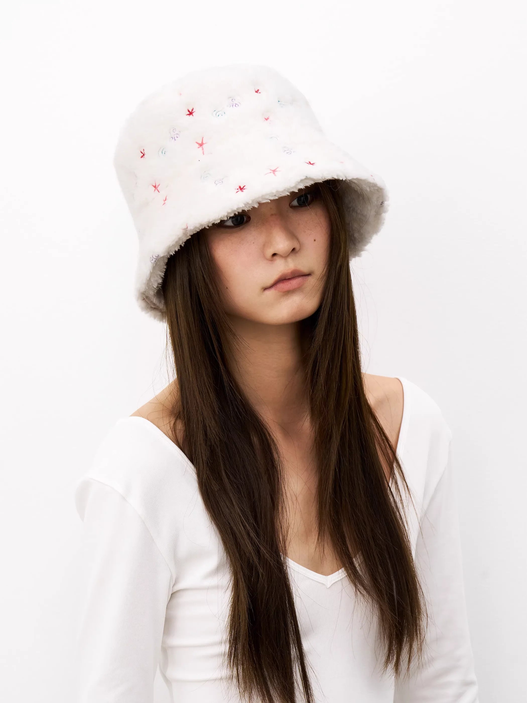 Stay warm and stylish with this cozy women's bucket hat, featuring a plush, fuzzy texture perfect for winter wear. The soft white design is accented with delicate star embroidery in red, pale blue, and purple, adding a whimsical touch to your cold-weather look. Crafted for both comfort and fashion, this hat also offers a face-slimming effect, making it a flattering accessory for chilly days.