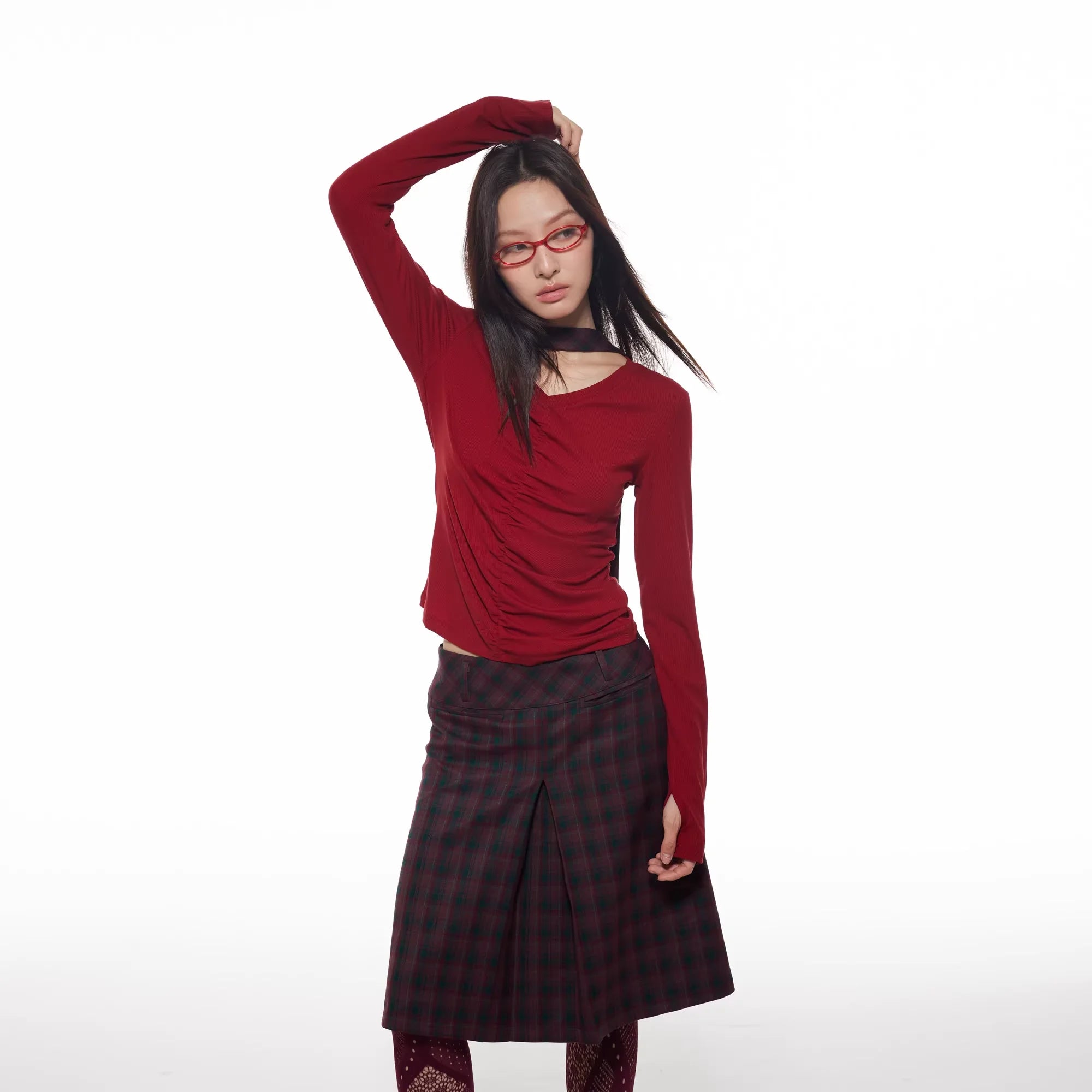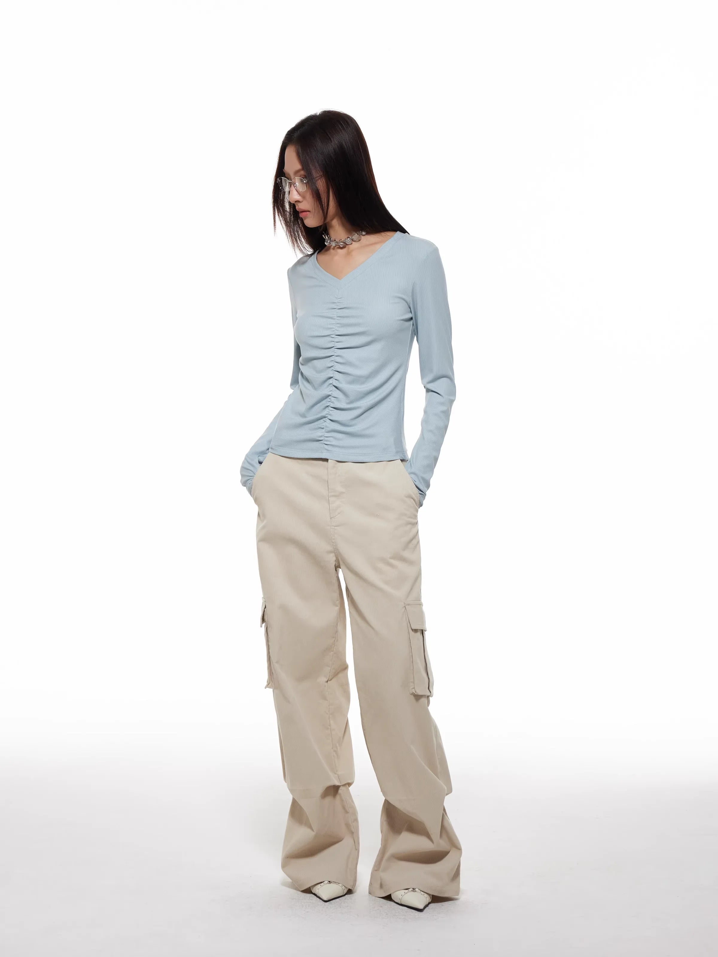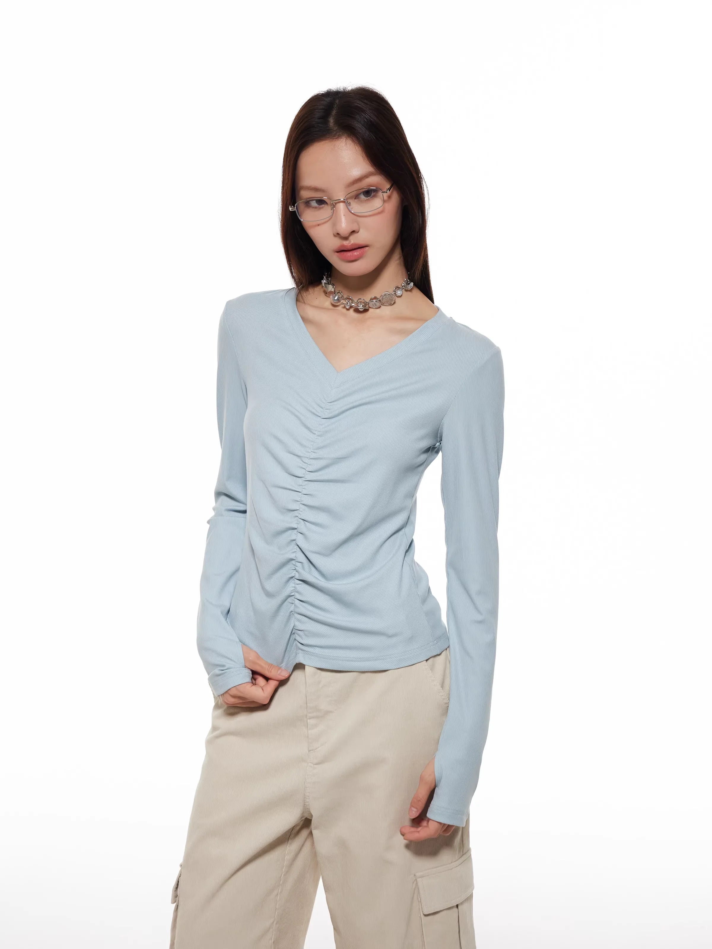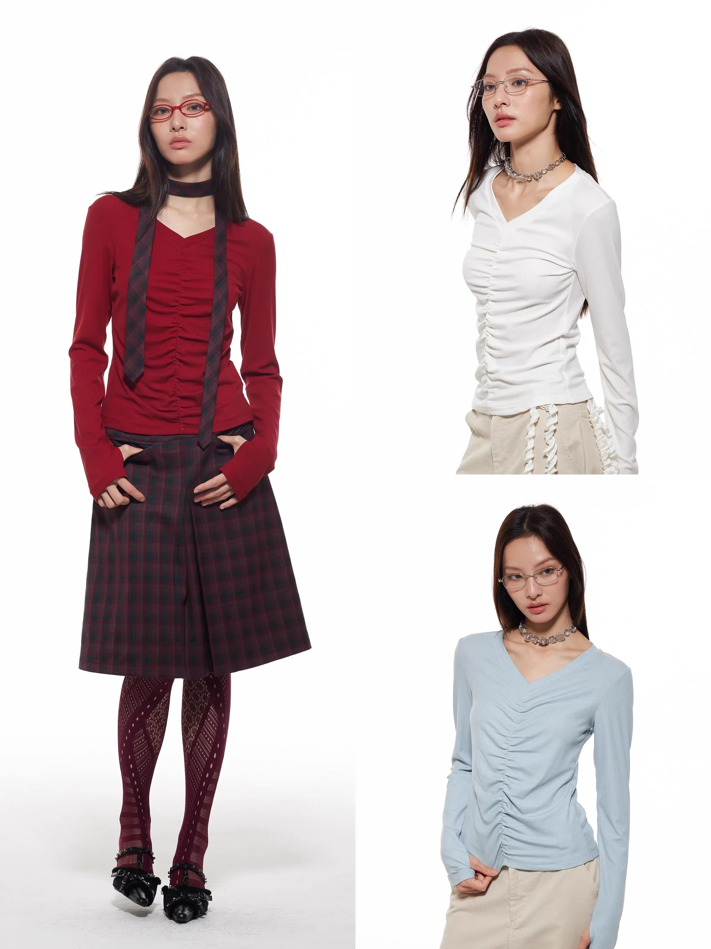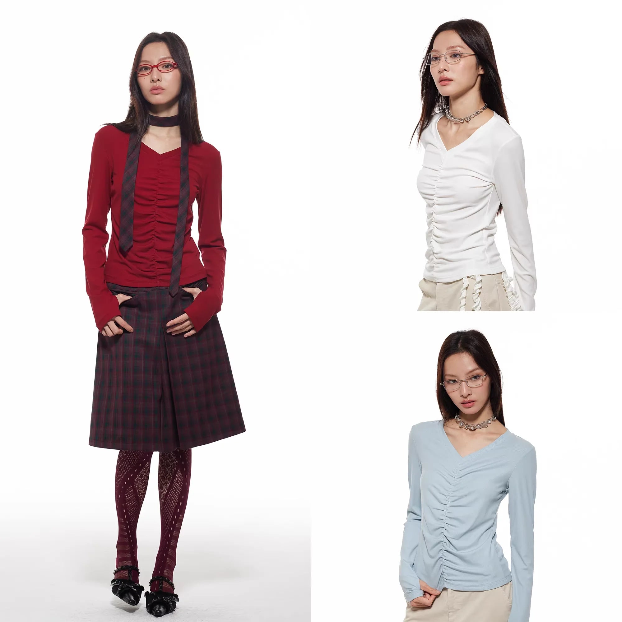 Elevate your wardrobe with this women's slim fit long sleeve top, designed with a flattering ruched V-neckline that adds texture and elegance. Crafted for cooler seasons, this versatile top pairs seamlessly with skirts or trousers for both casual and commuter styles. Available in deep red, white, and light blue, it features a pleated front and fitted silhouette, delivering a chic, modern appeal for autumn and winter wear.