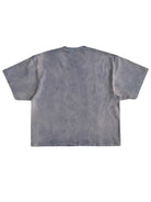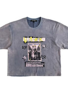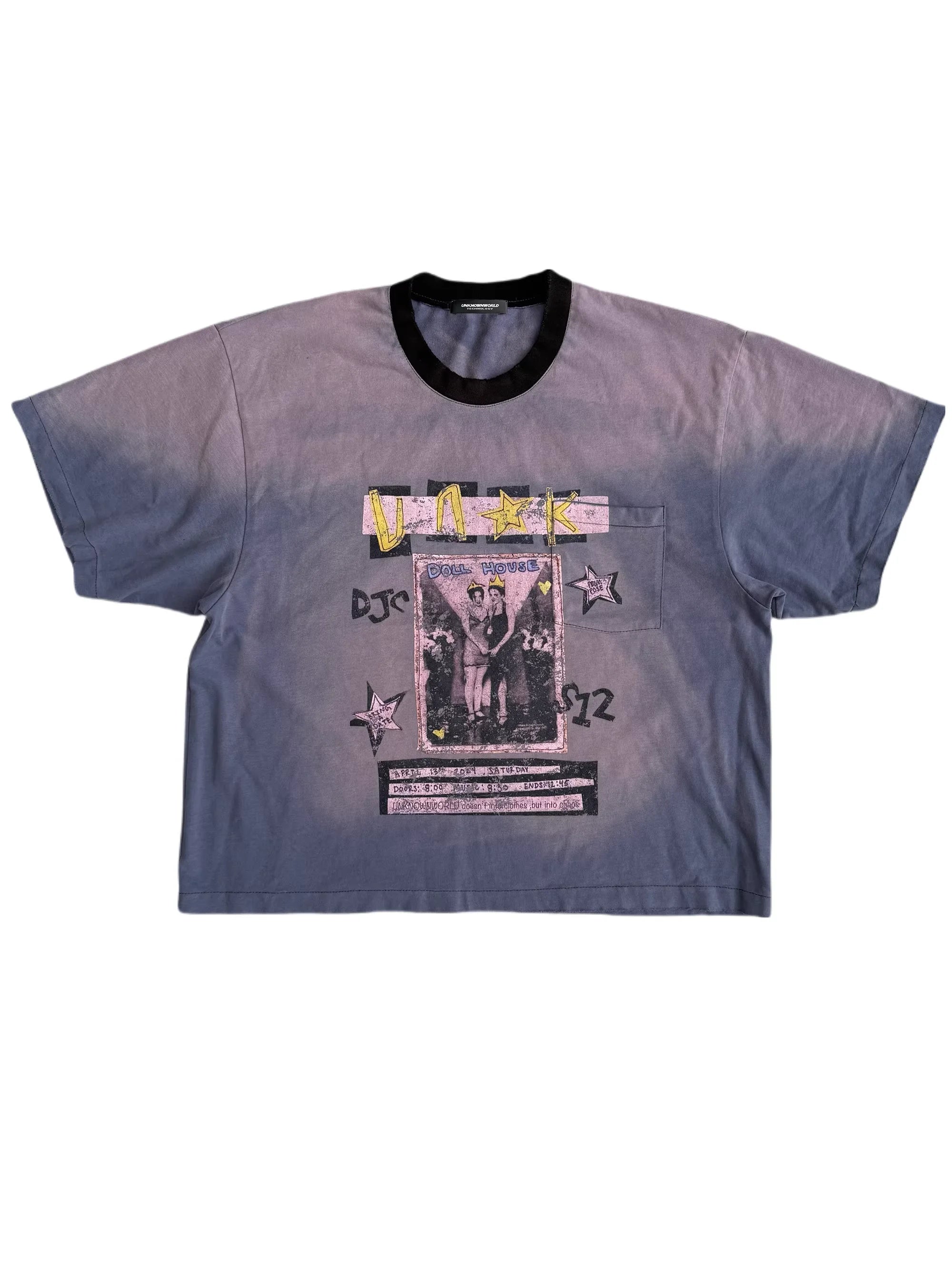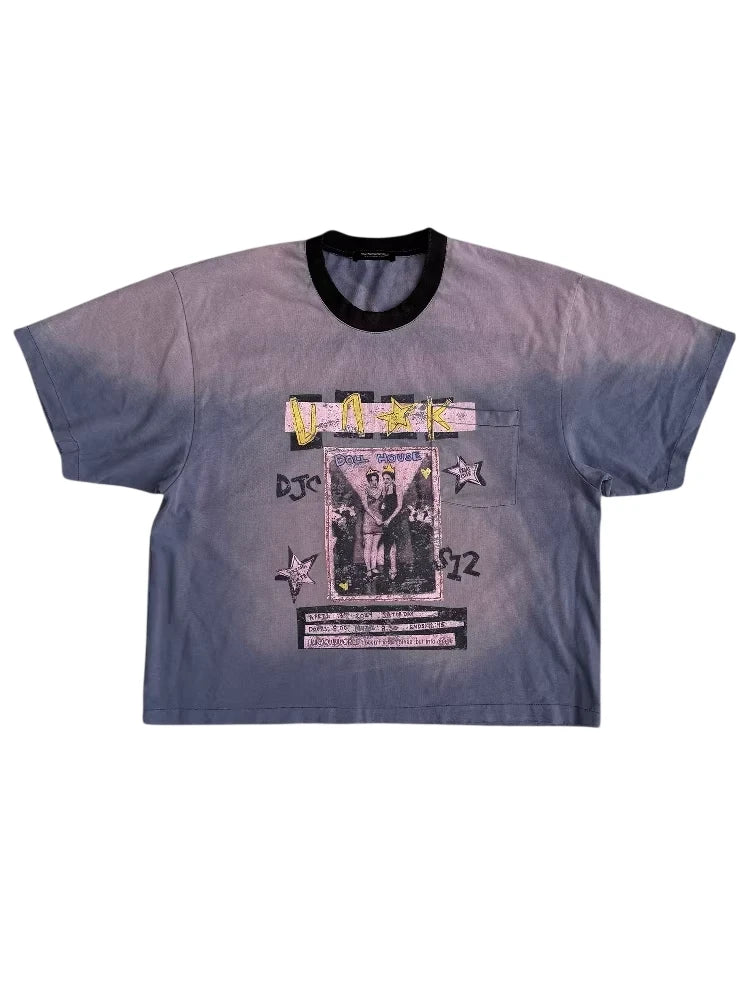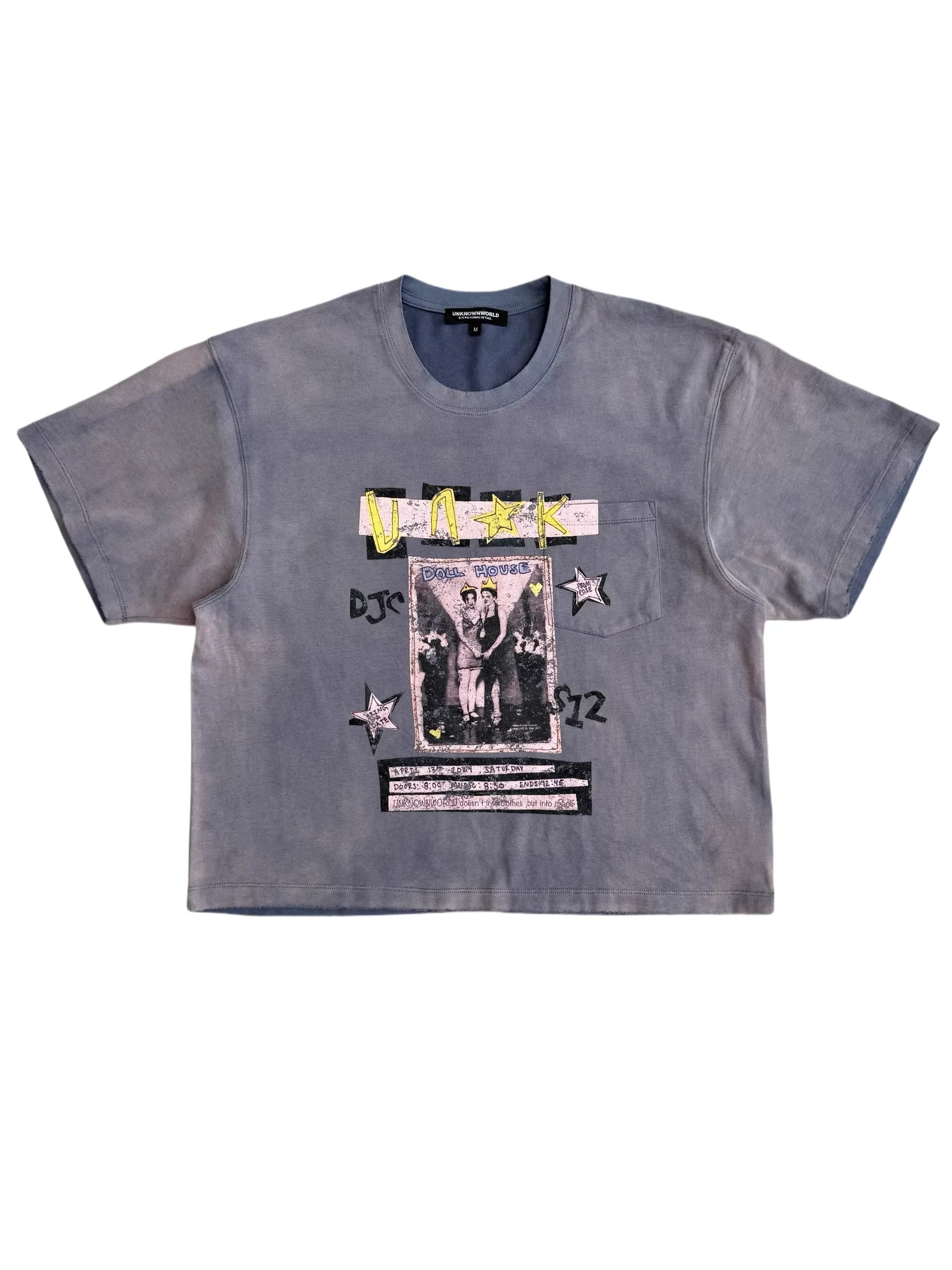 This men's short-sleeve crew neck t-shirt features a sun-faded charcoal gray wash and a bold, artistic front graphic. The vintage-inspired design includes a retro black-and-white photo labeled 'DOLL HOUSE,' accented with stylized text, stars, and vibrant yellow and pink highlights. A subtly integrated left chest pocket blends seamlessly into the print. Its relaxed, slightly oversized fit delivers a casual, contemporary streetwear aesthetic.