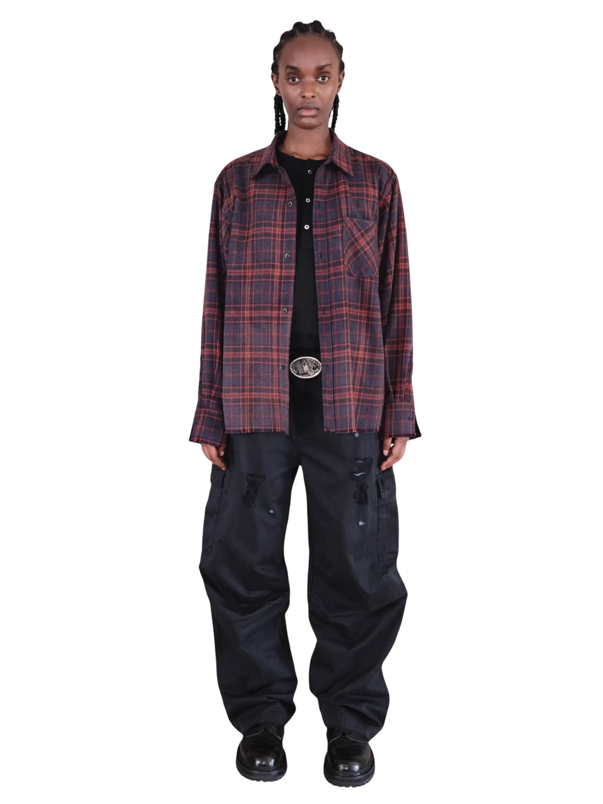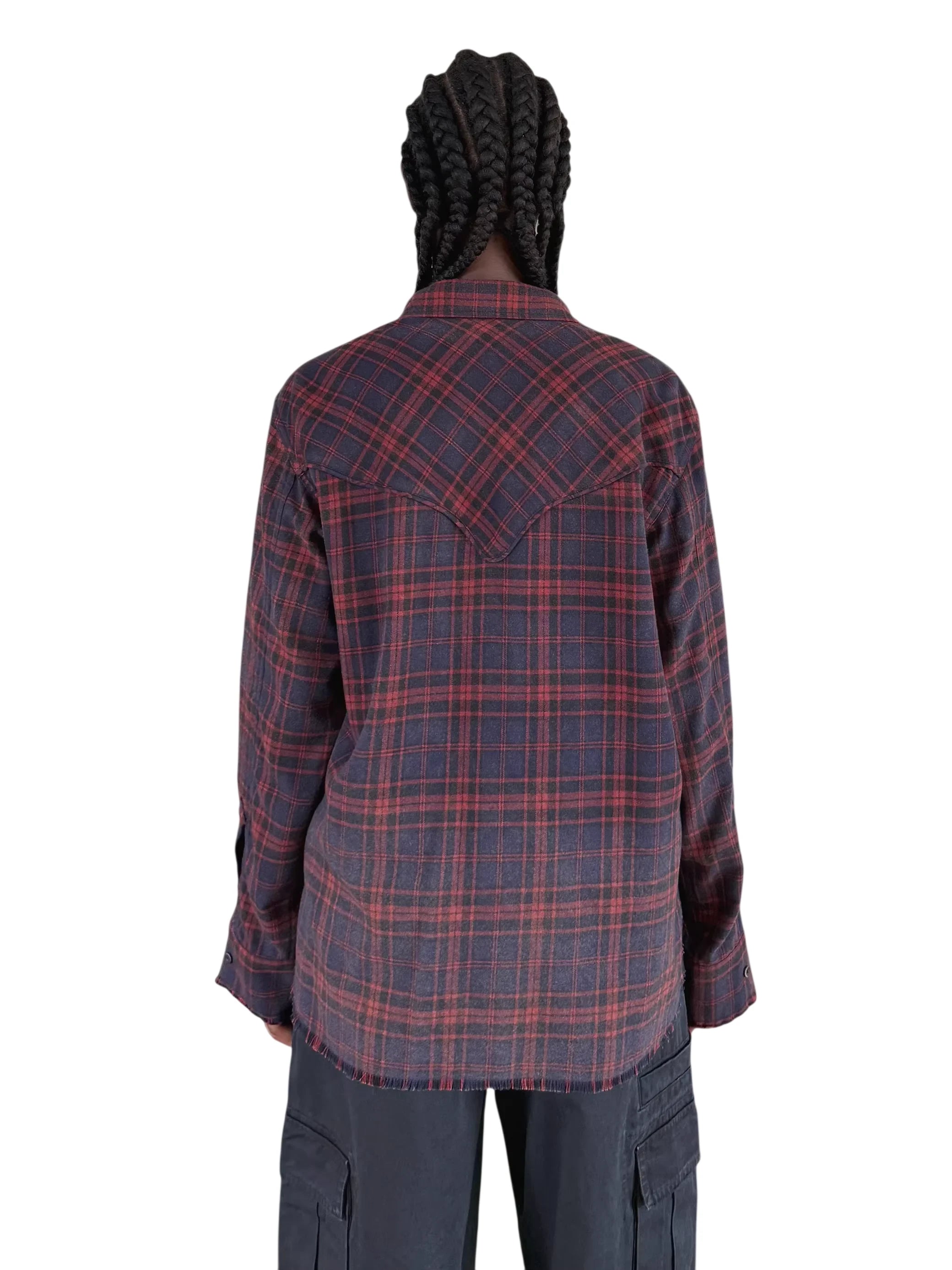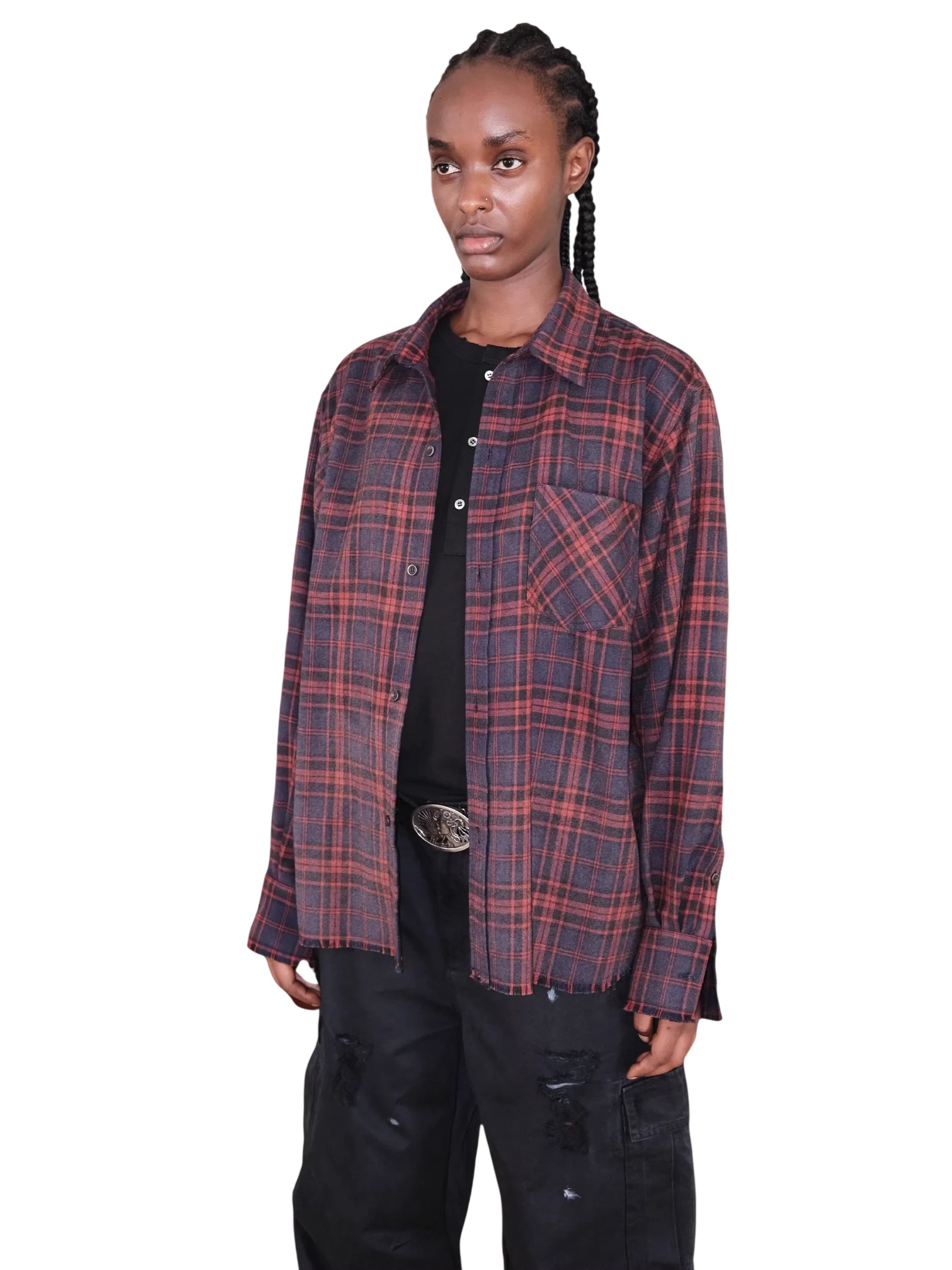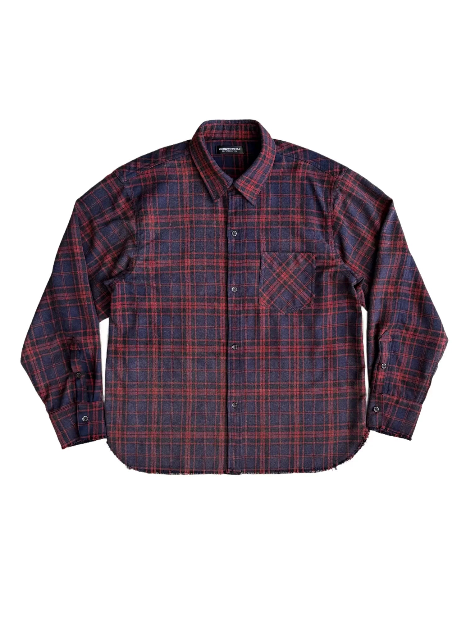 UNKNOWNWORLD Red and Navy Plaid Flannel Fringe Shirt