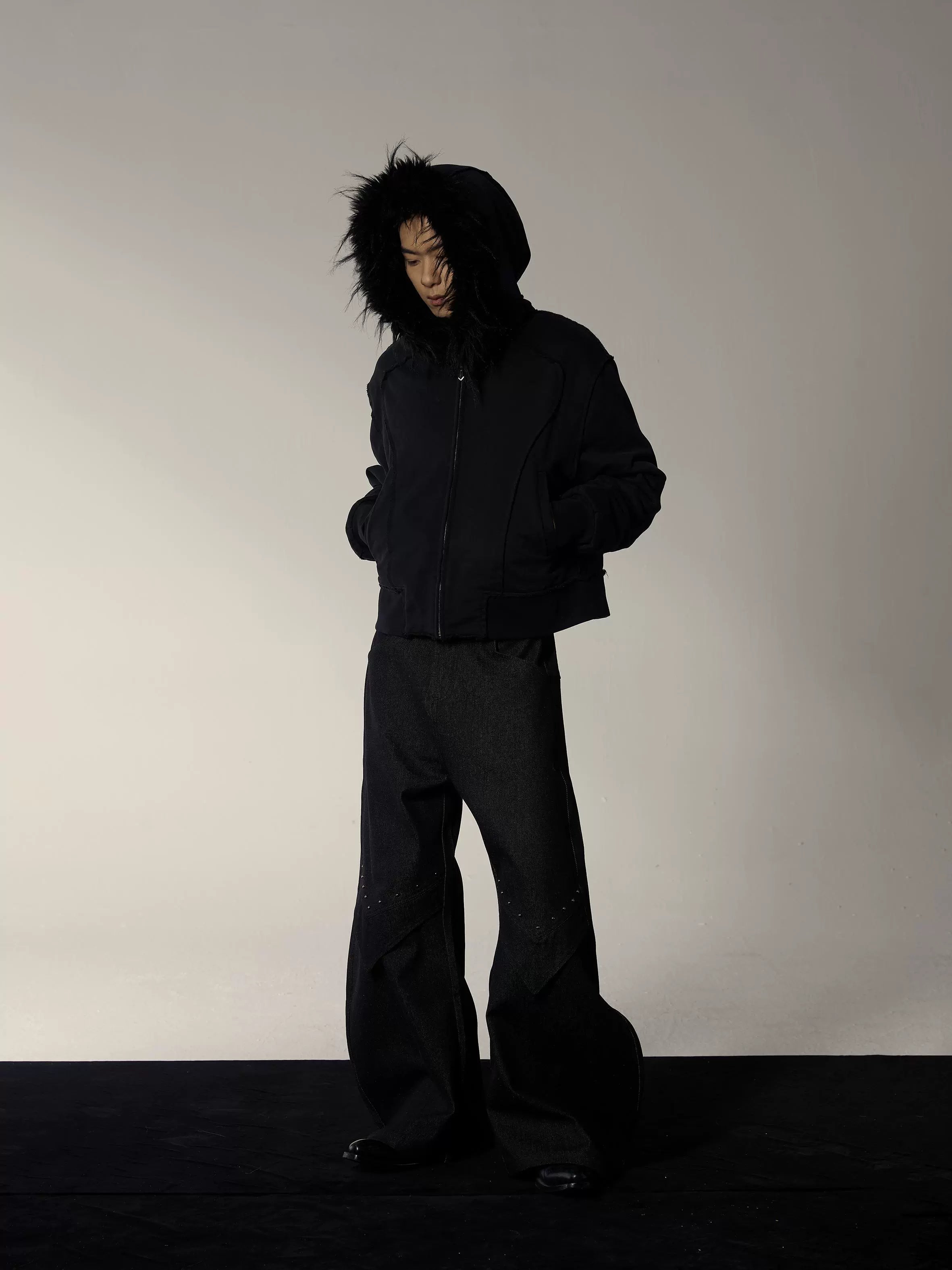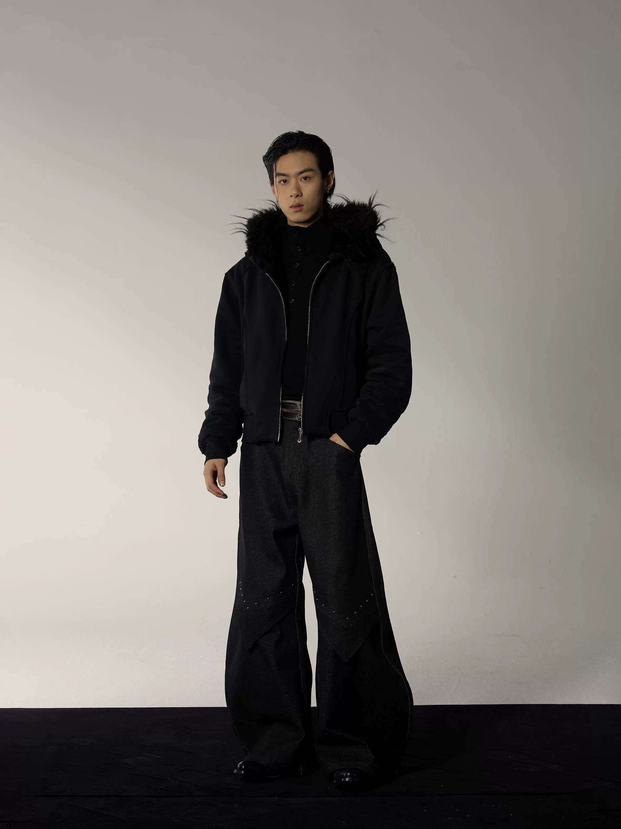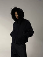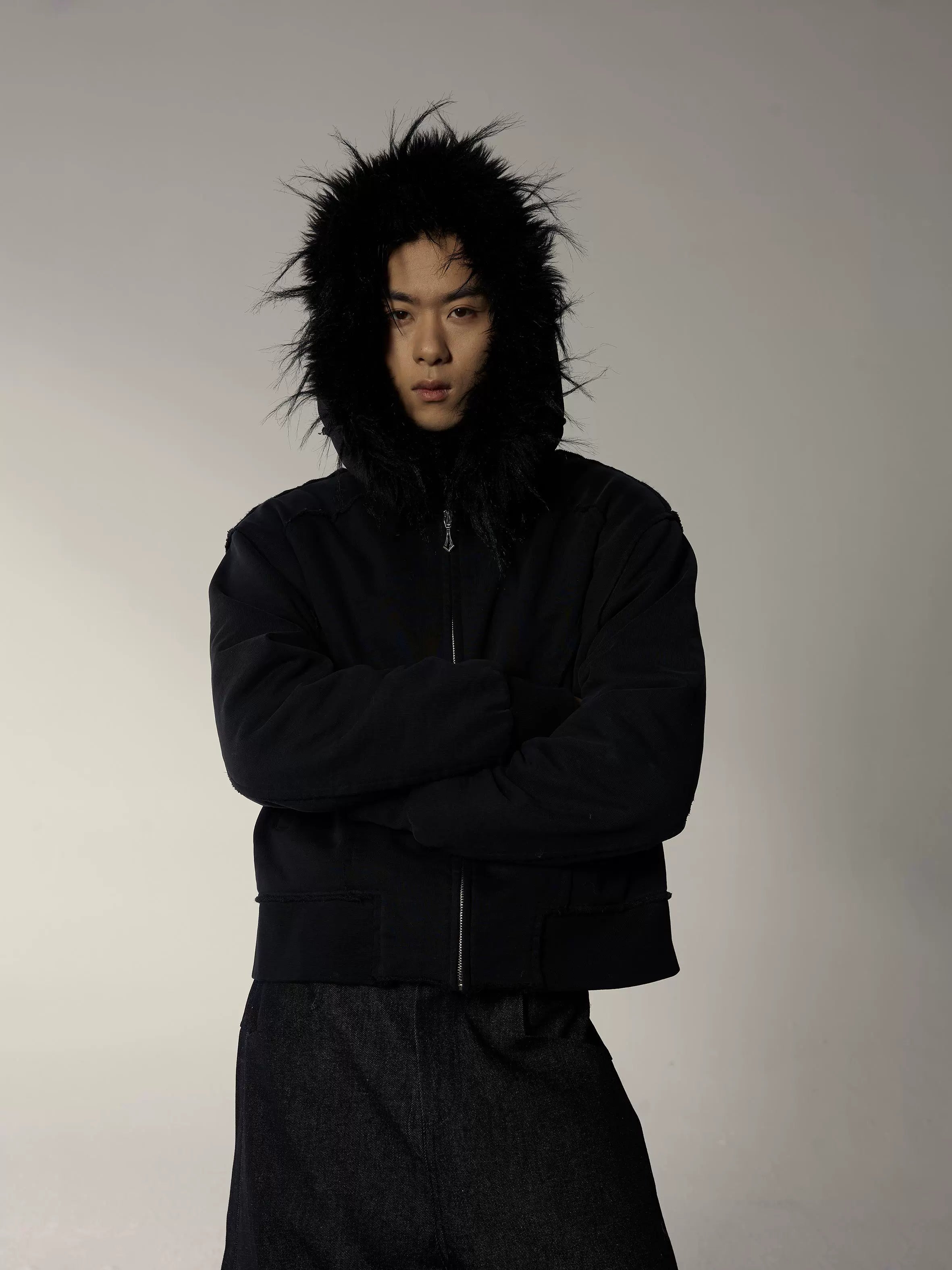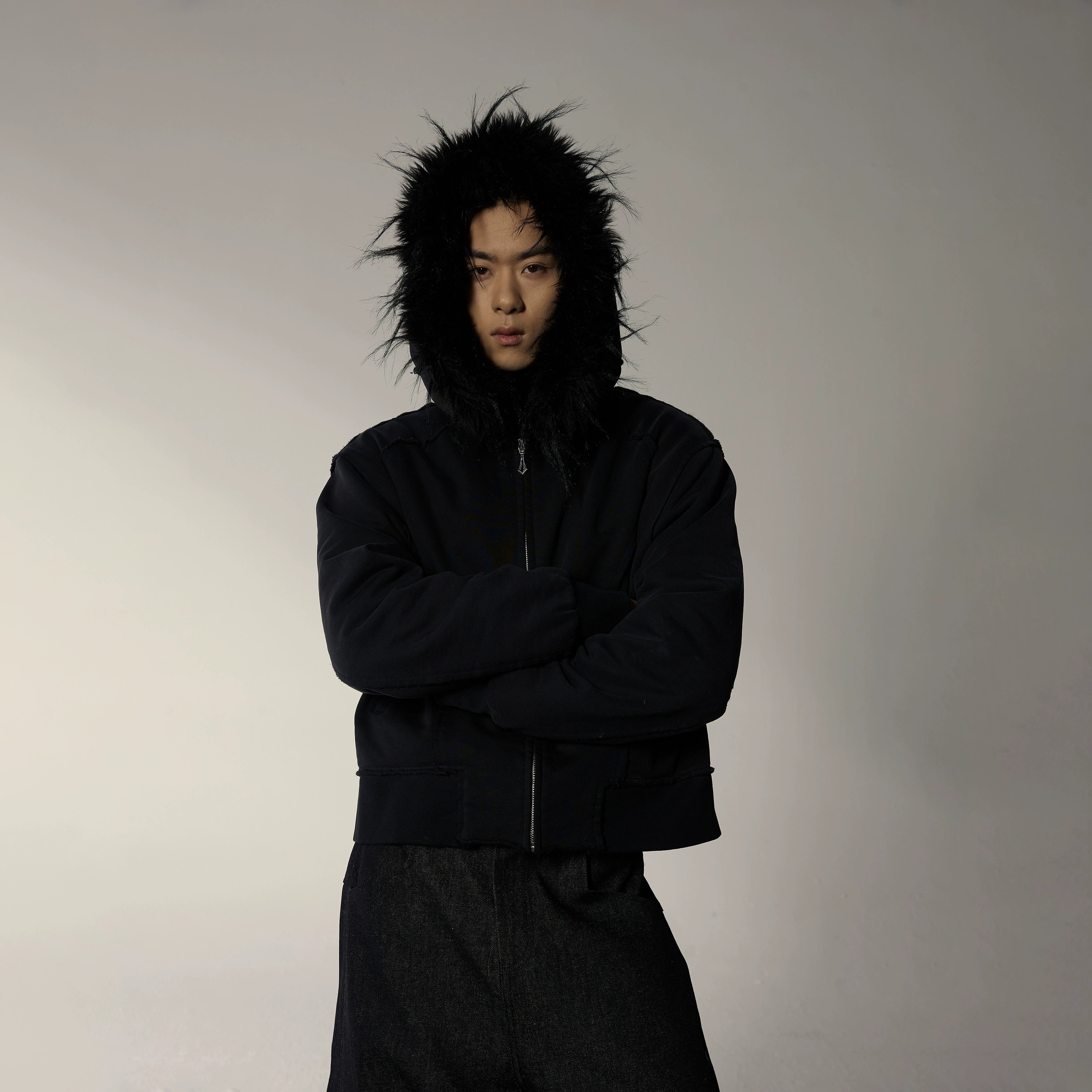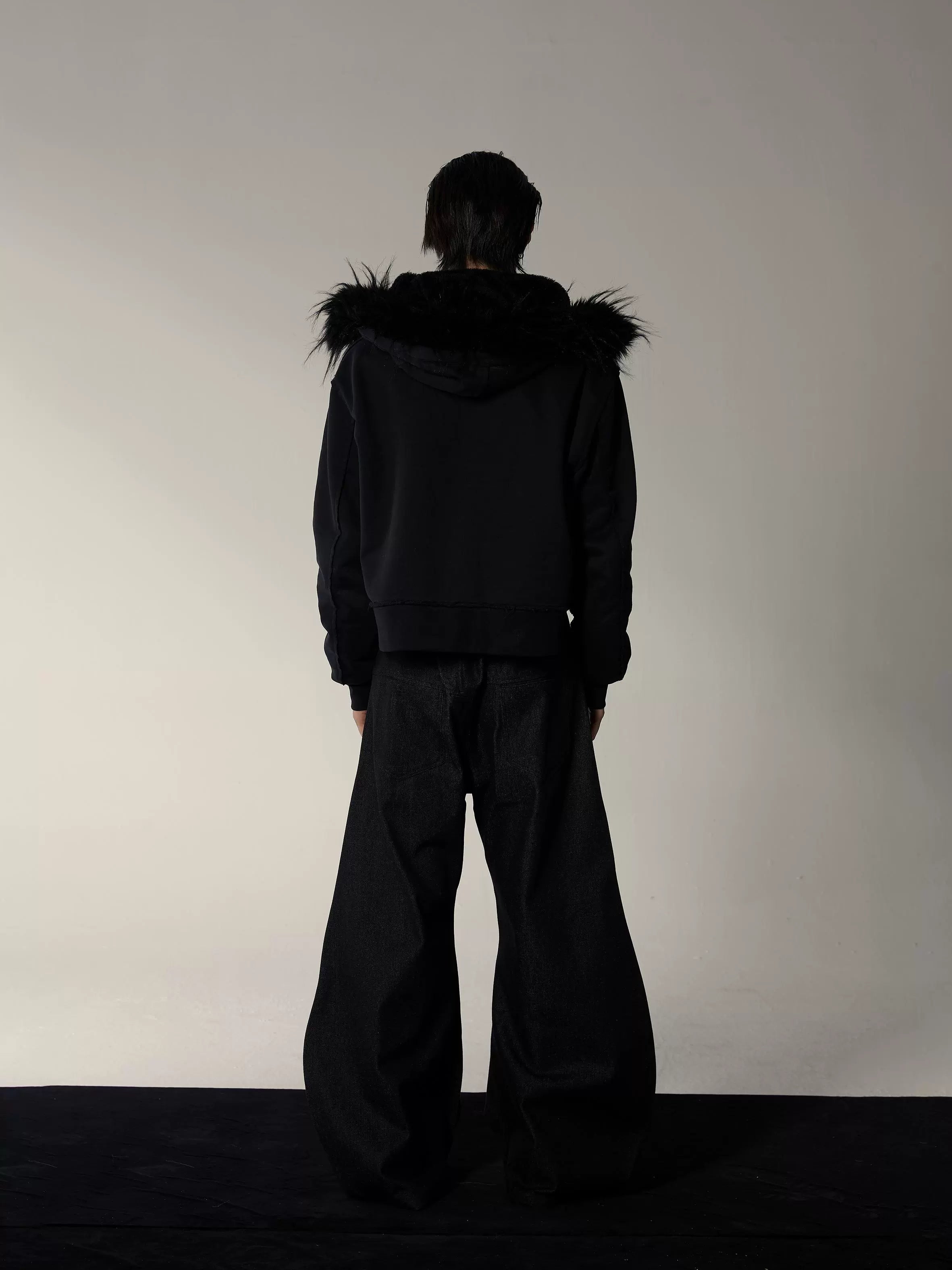 Y/OFFICAIL 黑天鹅可拆卸仿貂毛双面穿解构短款水洗做旧卫衣
