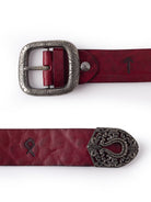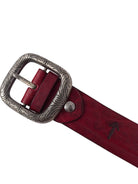 Crafted from full grain leather, this men's belt features a rich dark red hue and a slightly textured, washed finish that offers a timeless vintage appeal. The durable strap is paired with an intricately engraved silver-toned buckle showcasing swirling patterns for a Western-inspired touch. A single metal rivet secures the buckle, enhancing both style and strength. Minimalist yet bold, this belt adds a striking accent to any classic wardrobe.